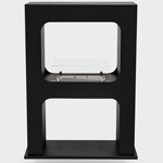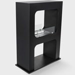 No Flue or Chimney required. Adjustable flame height. Brushed Stainless Burner system. Tempered Glass with Polished Stainless fittings. Double sided. Base area for real wood logs.