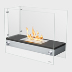 360 degrees viewing angle of the fire, 8 mm safety glass, Glass fittings in polished stainless steel, No flue or installation required, adjustable flame size, Burner with absorbing function for unprecedented safety.